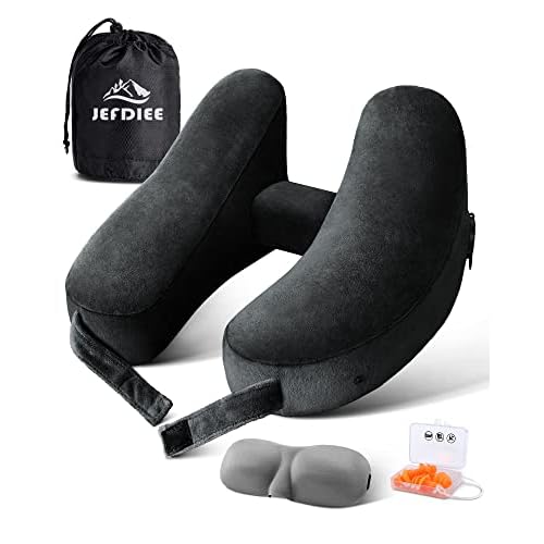 JefDiee Inflatable Travel Pillow, Airplane Neck Pillow Comfortably Supports Head and Chin for Airplanes, Trains, Cars and Office Napping with 3D Eye Mask, Earplugs and Portable Drawstring Bag (Blue)